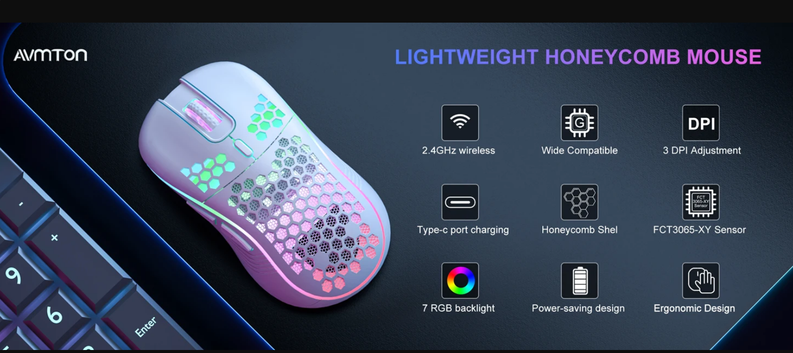 2.4G Wireless Mouse with RGB Backlit 6-Button 3-Speed DPI Type C Rechargeable Ergonomic Honeycomb Design Gaming Mouse